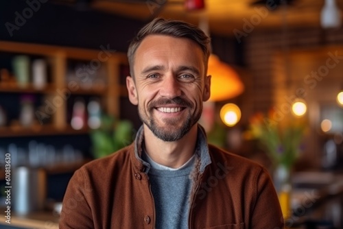 Portrait of handsome man smiling at camera while sitting in a cafe