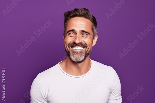 Portrait of handsome mature man smiling and looking at camera while standing against purple background.