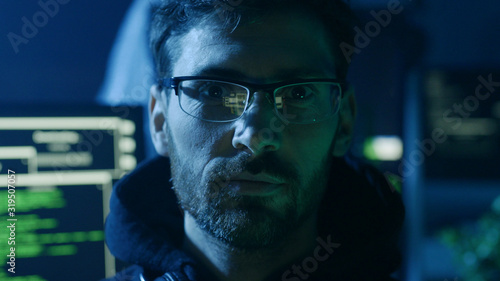 Portrait of handsome smart man in glasses working on computer looking at camera. Close-up of IT developer coding technologies in the studio.
