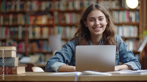 Portrait of happy attractive student girl posing for camera seated at desk with laptop and textbook, enjoy education in university, preparing for exams or high-school admission, studying in library