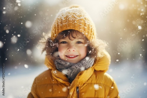 Portrait of happy child smiling under snowfall wearing winter clothes