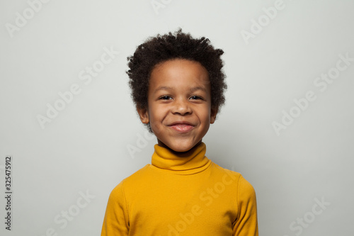 Portrait of happy little black kid boy smiling on white background