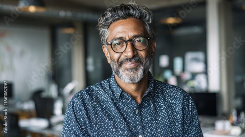 portrait of happy mature businessman wearing spectacles and looking at camera multiethnic satisfied man feeling confident in a creative office successful middle eastern business man smiling no logos