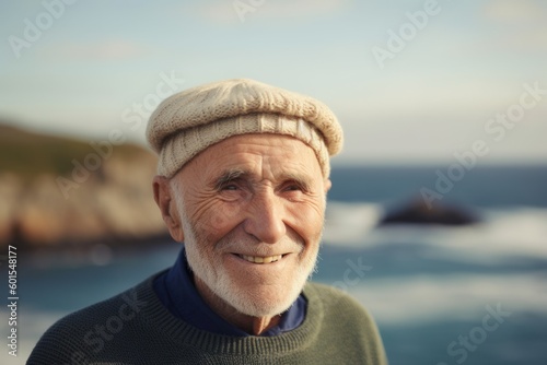 Portrait of happy senior man in cap and sweater standing at beach
