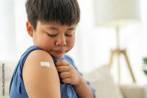 Portrait of happy smile vaccinated little asian kid boy children ages 5 to 11 years old posing show arm with medical plaster after Injection vaccine Covid-19 protection.coronavirus vaccination kid