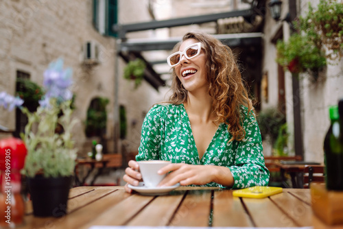 Portrait of happy woman drinking cup of coffee at wooden table on cozy veranda. Young tourist enjoying morning and hot drink outdoors. Tourism and drinks concept.