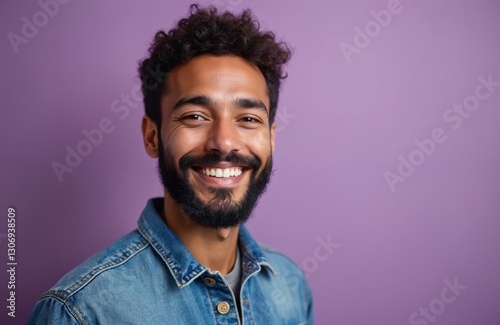 Portrait of happy young man with beard smiling against purple background. Cheerful handsome guy looking at camera. Positive male model with beard, curly hair in denim jacket, casual attire.