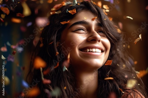 Portrait of Hispanic teen girl with colorful confetti. Head shot. Generative AI