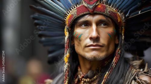 Portrait of Indigenous Man in Traditional Headdress Celebrating Cultural Heritage on International Day of the World's Indigenous Peoples