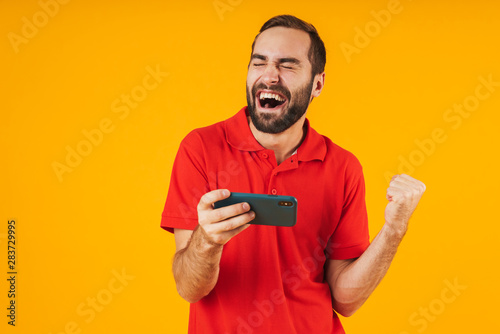 Portrait of joyful man in red t-shirt smiling and holding smartphone while playing video games