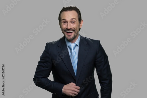 Portrait of laughing businessman on gray background. Overjoyed businessman is laughing hard at something hilarious.