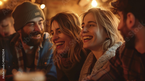 Portrait of laughing females having fun together in a bar, drinking beer and enjoying time at the pub with their male friends