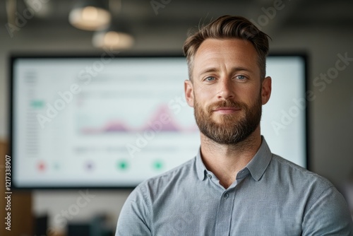 portrait of marketer standing confidently near large screen displaying social media insights modern office copy space