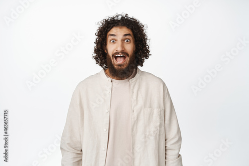Portrait of middle-eastern man with beard looking amazed, smiling fascinated at camera, standing in casual clothes over white background