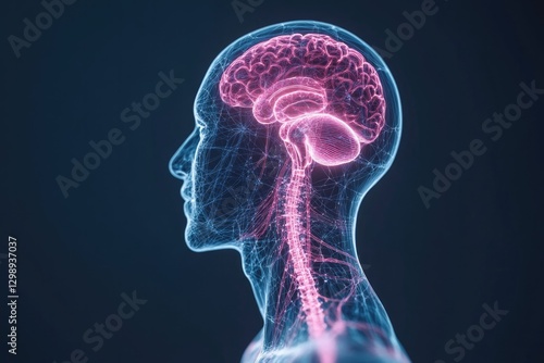 portrait of neon-lit anatomical model showing nervous system complex structure including detailed nerve pathways