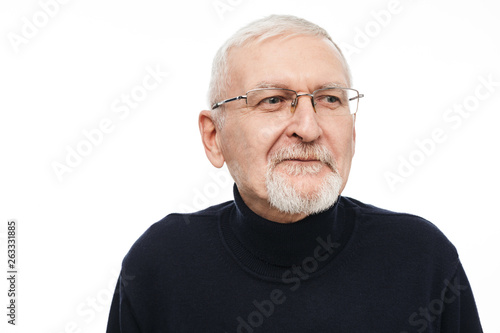 Portrait of old handsome man with gray hair and beard in eyeglasses and black sweater happily looking aside over white background isolated