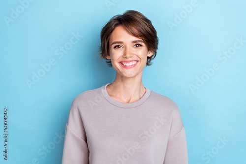Portrait of optimistic good mood girl with bob hairstyle wear gray sweatshirt toothy smiling at camera isolated on blue color background