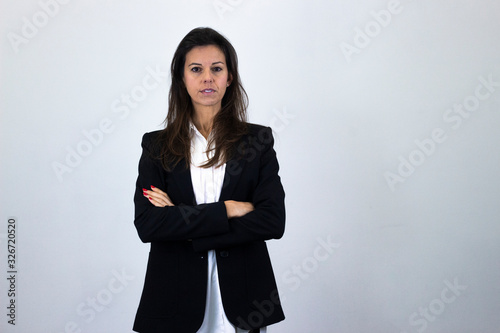 Portrait of pretty caucasian bussiness woman stands with arms folded, isolated on gray background studio shot, white shirt and black jacket, dark air. Place for your text in copy space.