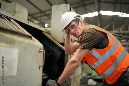 Portrait of Professional Heavy Industry Engineer / Worker Wearing Safety Uniform, Goggles and Hard Hat. In the Background Unfocused Large Industrial Factory
