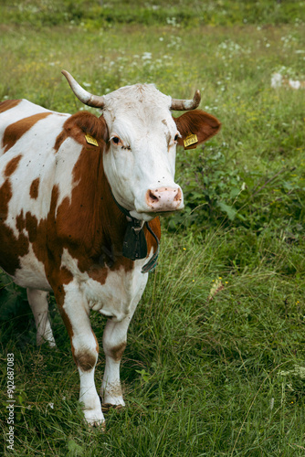 Portrait of red and white cow on a blurred green natural background. White cow with red spots. Cattle and farming concepts.