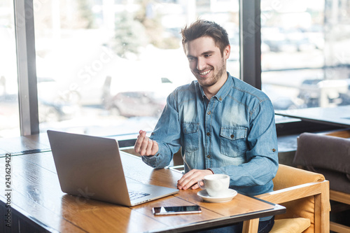 Portrait of satisfied happy young freelancer in blue jeans shirt are sitting in cafe and agrees with his employer for payment through webcam and showing cash gesture with toothy smile. Indoor, inside