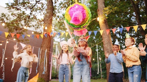 Portrait of small girl smash pinata with friends and presents outdoors in summer. Happy birthday concept