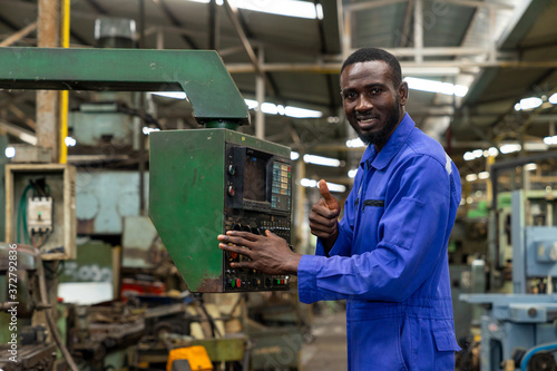 Portrait of smiling african american factory worker showing thumb up. Technician engineer control machines in the workplace on a business day. Concept of Industrial manufacturing.