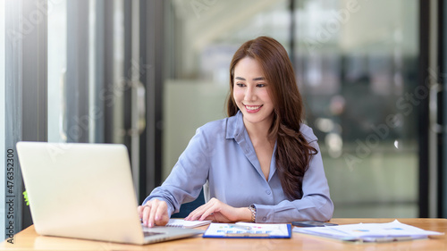 Portrait of smiling beautiful Asian businesswoman enjoy the idea sitting with laptop computer at office.