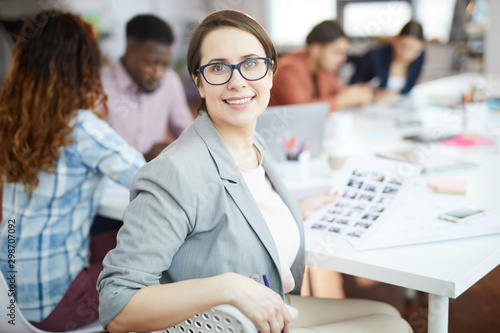 Portrait of smiling businesswoman looking at camera while sitting at meeting table with creative team in office