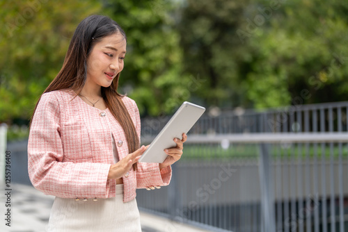 Portrait of smiling happy woman relax using digital tablet.Young asian girl working or study,chatting social network and playing game online or social media,shopping online