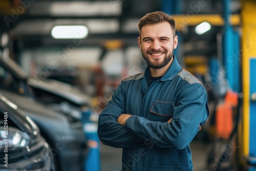 Portrait of smiling mechanic with crossed arms in auto repair shop, copy space