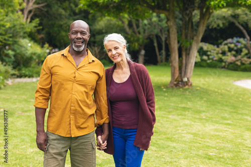 Portrait of smiling multiracial senior couple spending leisure time together in backyard