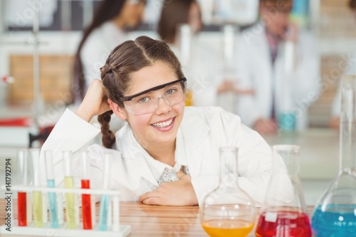 Portrait of smiling schoolgirl leaning on table in laboratory