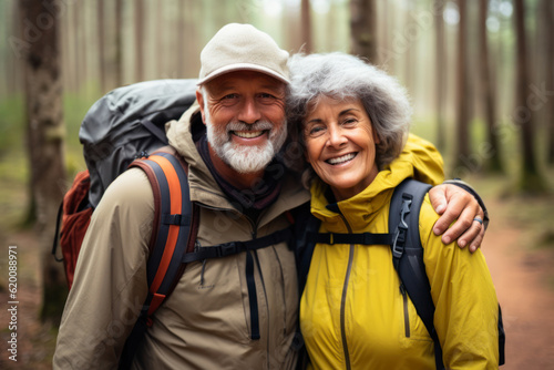 Portrait of smiling senior couple sitting with backpack in forest during summer vacation. AI Generative