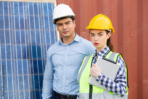 Portrait of solar cell industrial worker and engineer foreman looking at camera standing at construction site.
