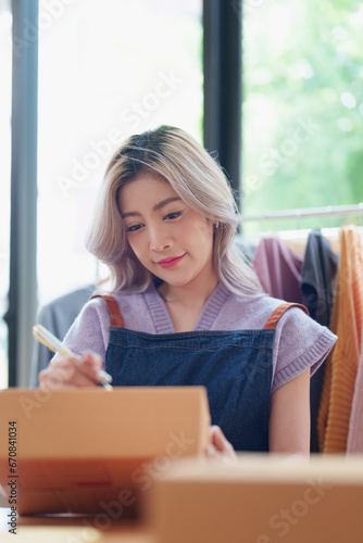 Portrait of Starting small businesses SME owners, family business check online orders Selling products working with boxes freelance work at home office, sme business online small medium enterprise