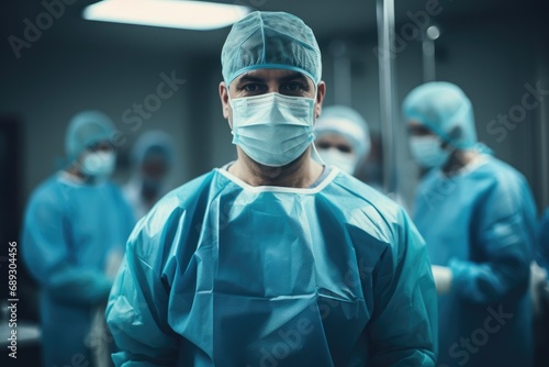 Portrait of surgeon standing in operating room with colleagues in the background, A focused doctor in scrubs and mask stands in an operating room, AI Generated