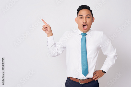 Portrait of surprised young Asian man in formal wear standing pointing fingers aside at copy space for advertisement and open mouth isolated on white background