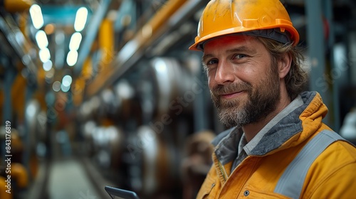 Portrait of technician standing inside heating plant boiler department. Portrait of Engineer standing near pipes.