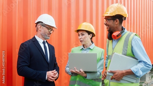 Portrait of two professional happy workers of transportation company talking with elegant successful boss in suit. African engineer, caucasian woman employee and ceo in helmets near container.