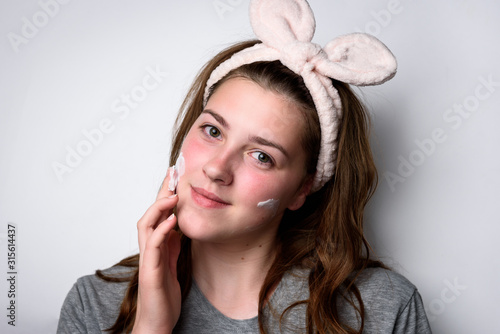 Portrait of woman applying cream on a clean fresh face on gray background.