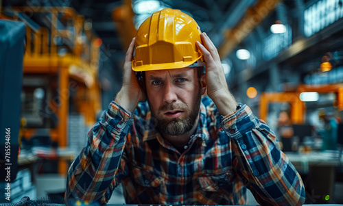 Portrait of worker in hard hat at large metalworking plant. man works at machine.