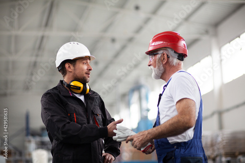 Portrait of workers in factory. Colleagues with helmet working in factory.