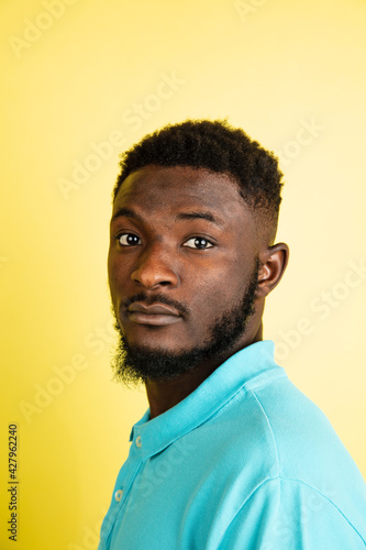 Portrait of young African man isolated over yellow studio background with copyspace.