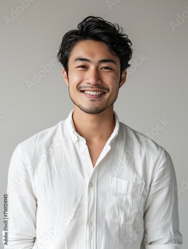 Portrait of young handsome Asian man smiling and looking camera with confidence.