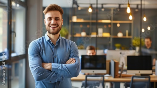 Portrait of young handsome smiling business guy wearing gray shirt and glasses, feeling confident with crossed arms, isolated on white background