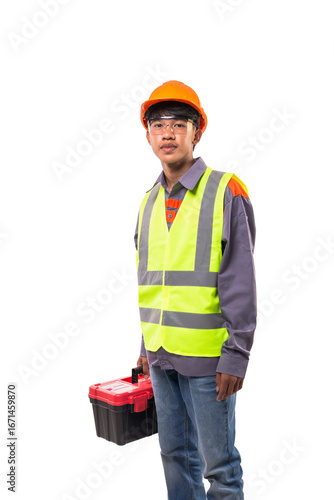 Portrait of young male engineers holding a toolbox standing isolated on white background