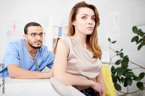 Portrait of young Middle-Eastern doctor using stethoscope and listening to breathing of beautiful young woman smiling cheerfully during consultation in modern clinic