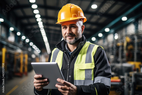 portrait photograph of Professional Heavy Industry Engineer/Worker Wearing Safety Uniform and Hard Hat Uses Tablet Computer.generative ai