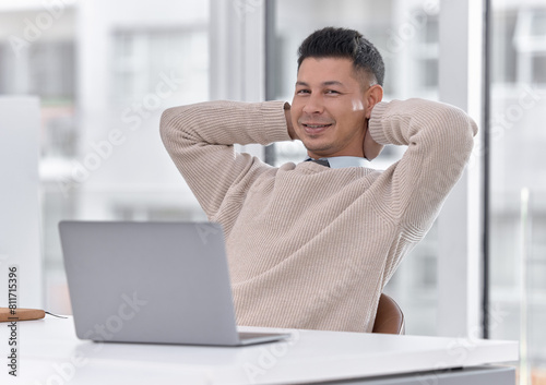 Portrait, relax and business with man, laptop and completed task with network, connection and smile. Face, employee and entrepreneur with computer, startup and finish project with stretching and calm